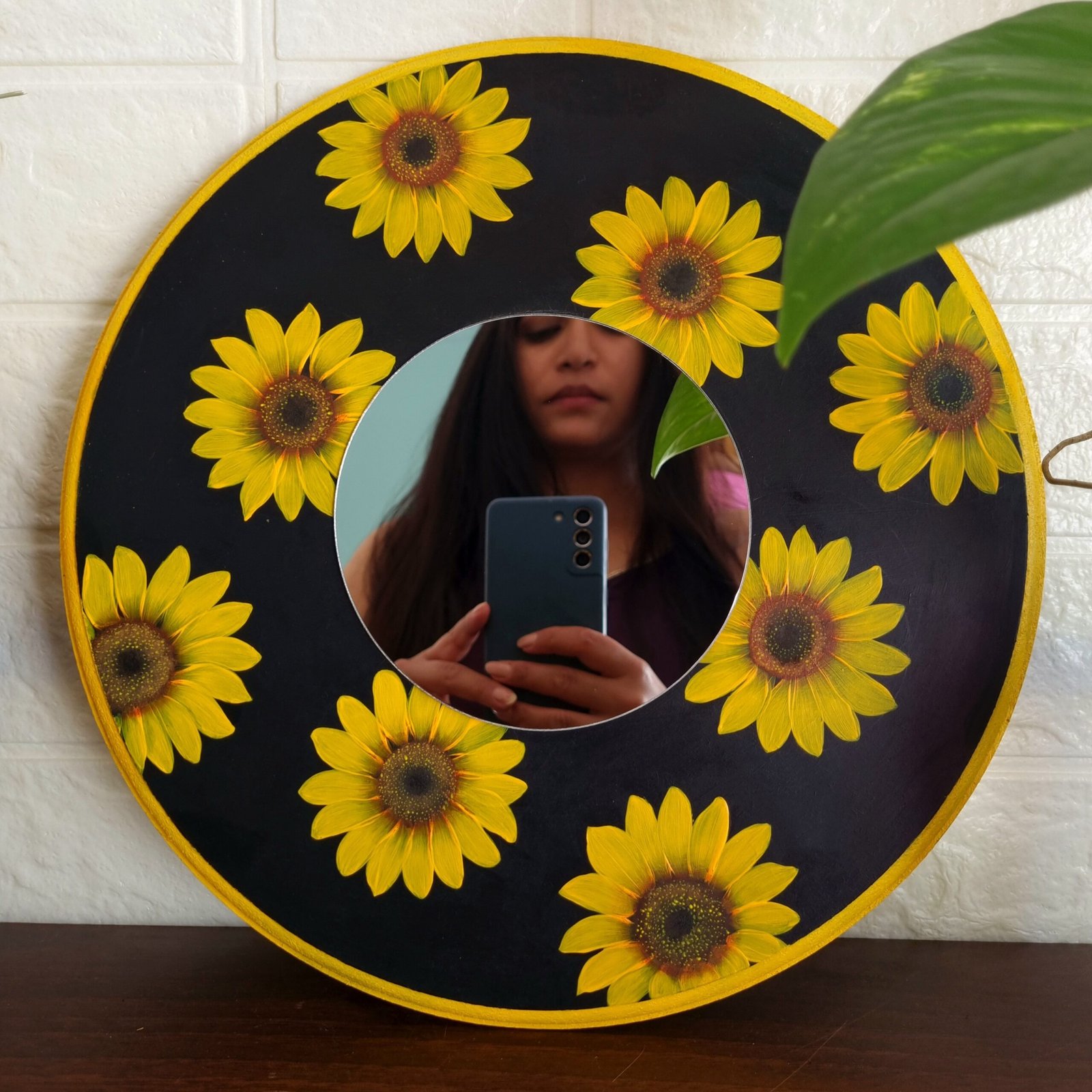 – Handmade wall mirror featuring vibrant yellow flowers painted on its surface